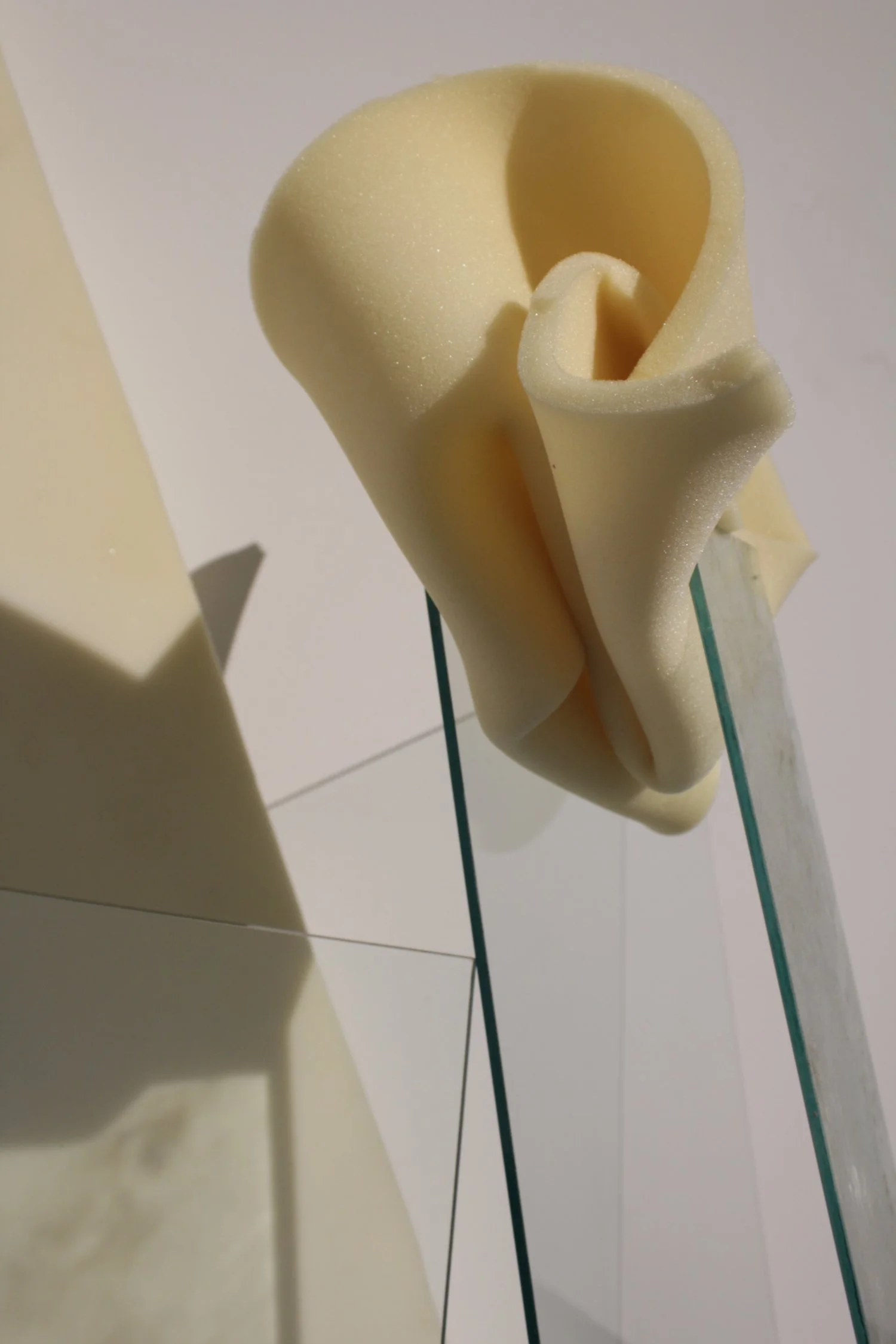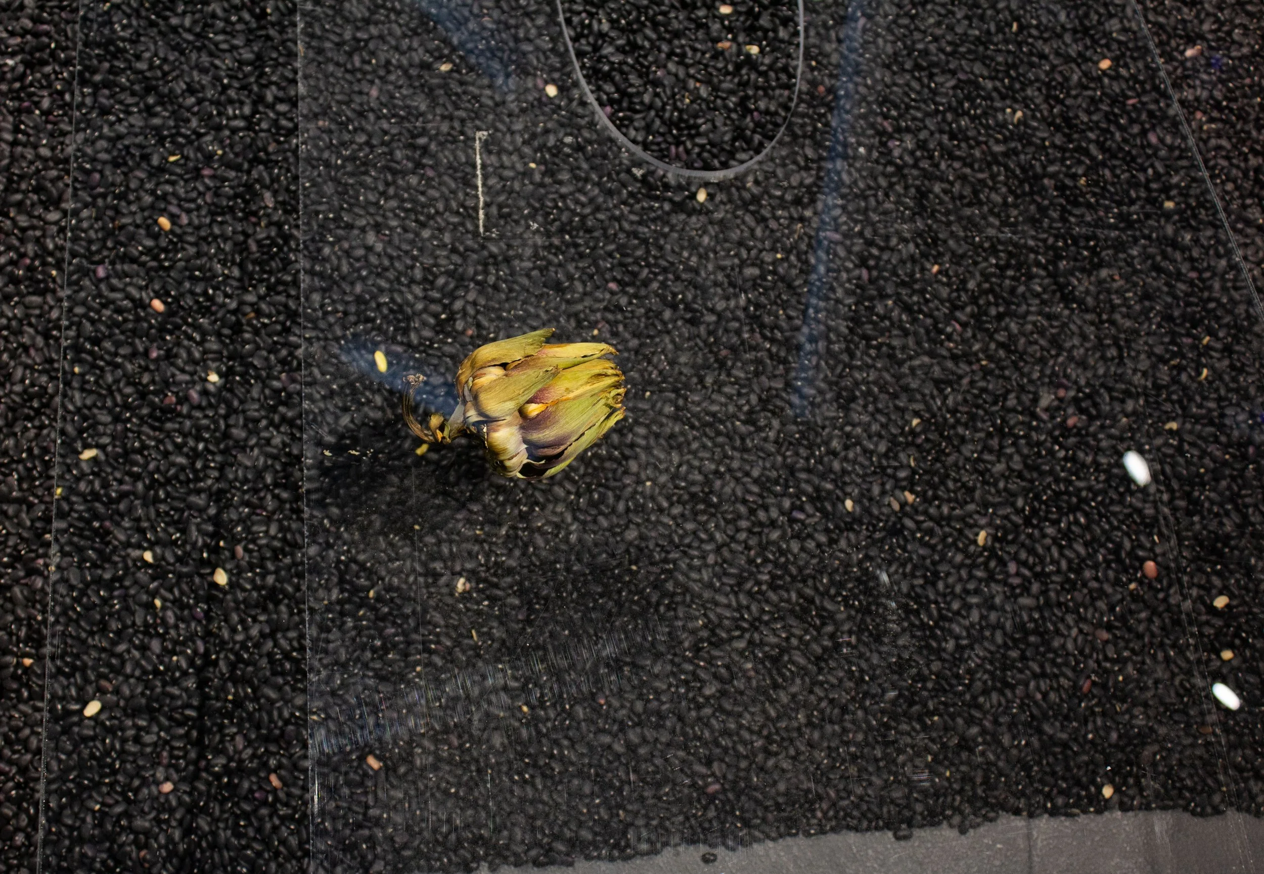Plexiglass carved to the approximate distance between the average American’s financial inability to afford a home, artichoke heart, American yearly food consumption measured in black beans, cotton, from, cement pipe, stolen documentation from a lover who stole this sculpture and installed it in California